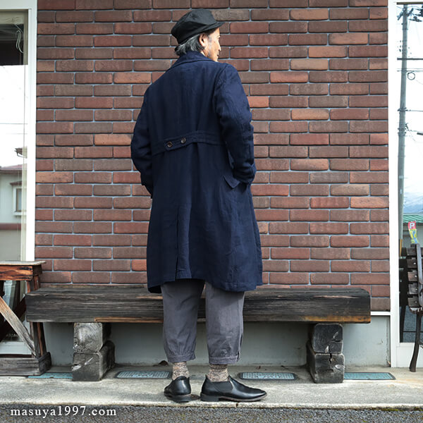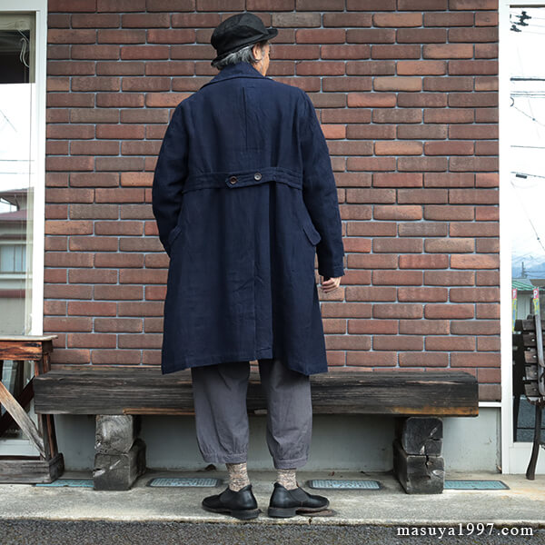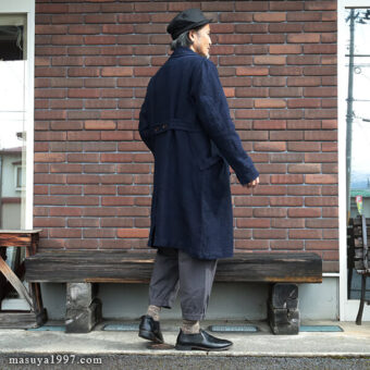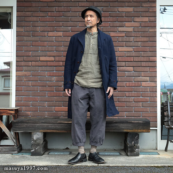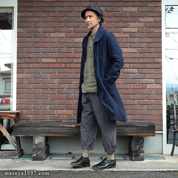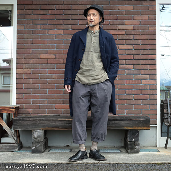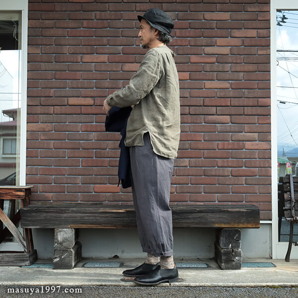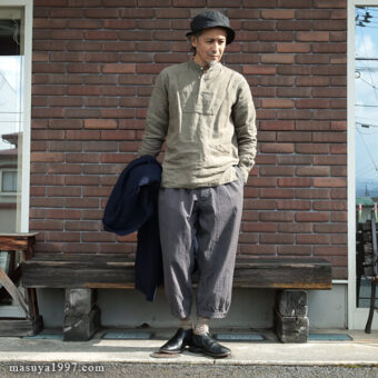 今回は、インナーにオールドホームステッダーのタートルネック・ロングスリーブ、ボトムにはジャンゴのコットンリネン・トラウザー を合わせています。
