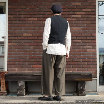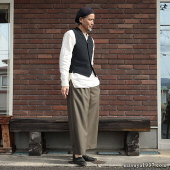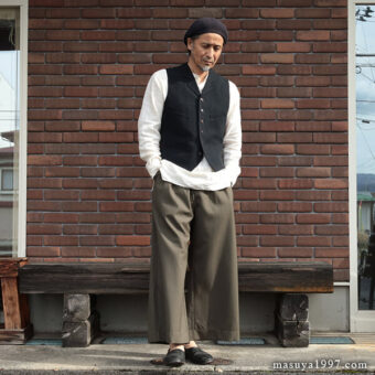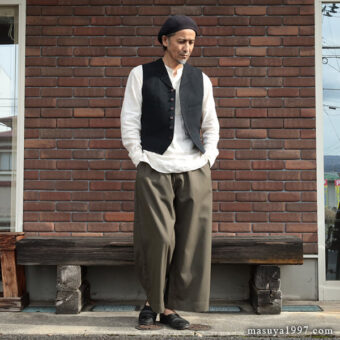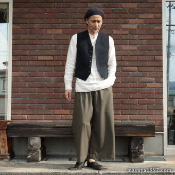 今日も、ジャンゴアトゥールの インディゴ・イージーニッカーズ をベースにコーディネート。トップスには “victorians heavylinen blouson 1880” を合わせています。