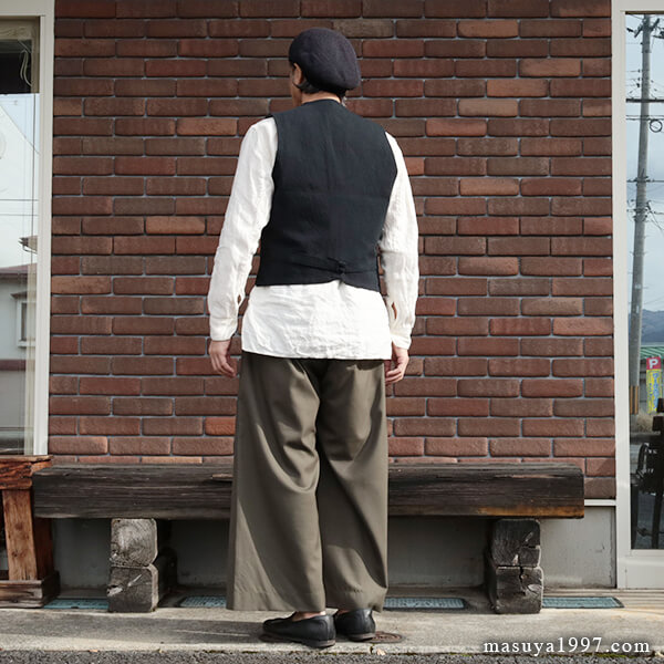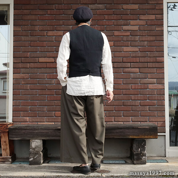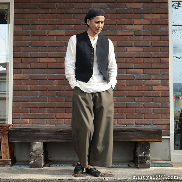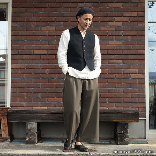 「前回」は、パンツ・ベスト ともにブラックでしたので、今回はソルジャー・グリーンのパンツに、ブラウンのベストを合わせています。この色合わせもいいでしょう〜!