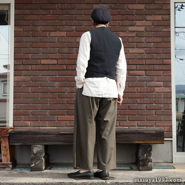 また、定番ワイドグルカ同様に、裾直しの丈の長さで様々な表情を楽しませてくれるパンツです。 着用画像では、短めに仕上げています。