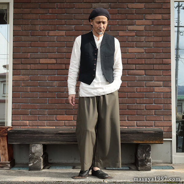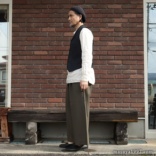 今日も、ジャンゴアトゥールの インディゴ・イージーニッカーズ をベースにコーディネート。トップスには “victorians heavylinen blouson 1880” を合わせています。