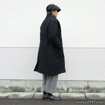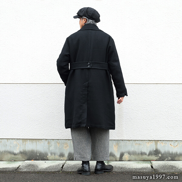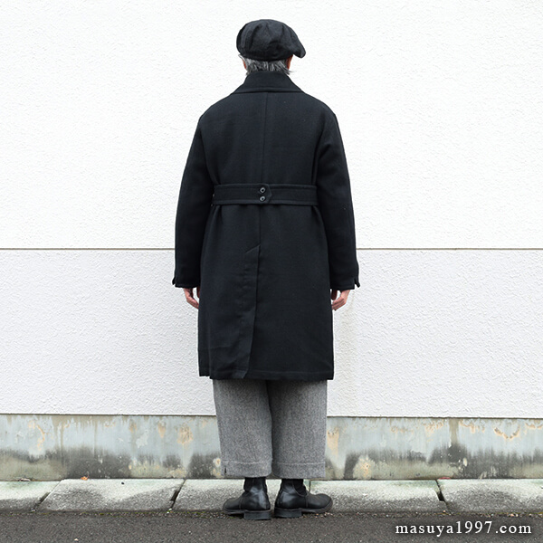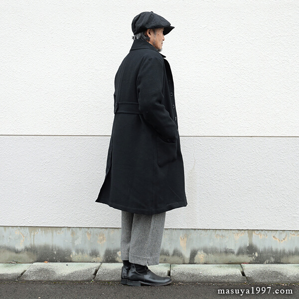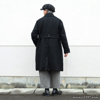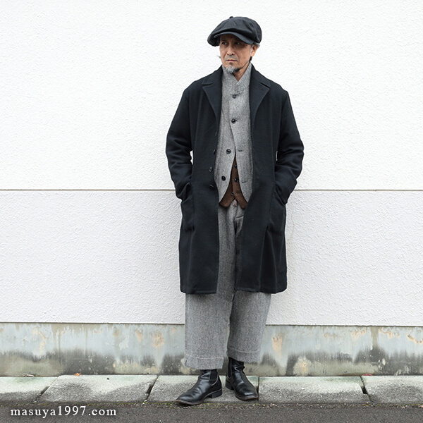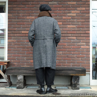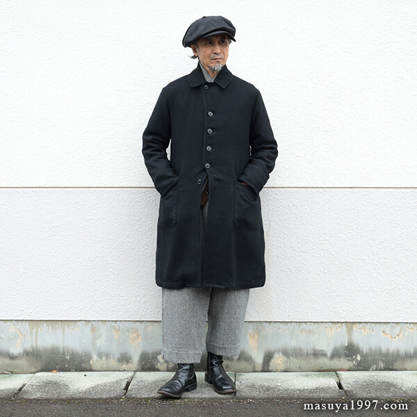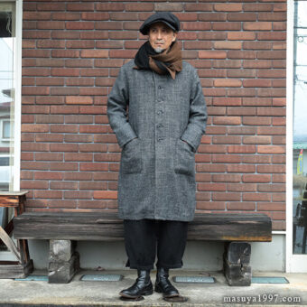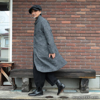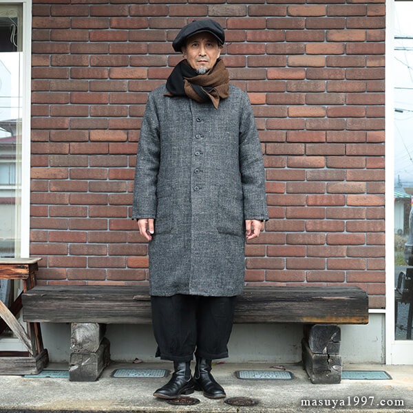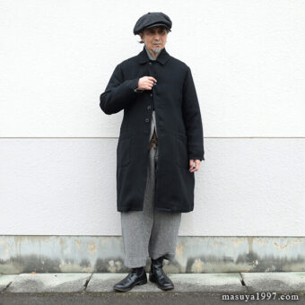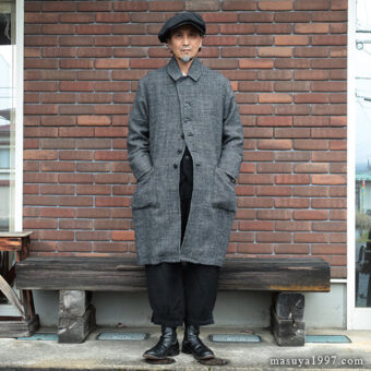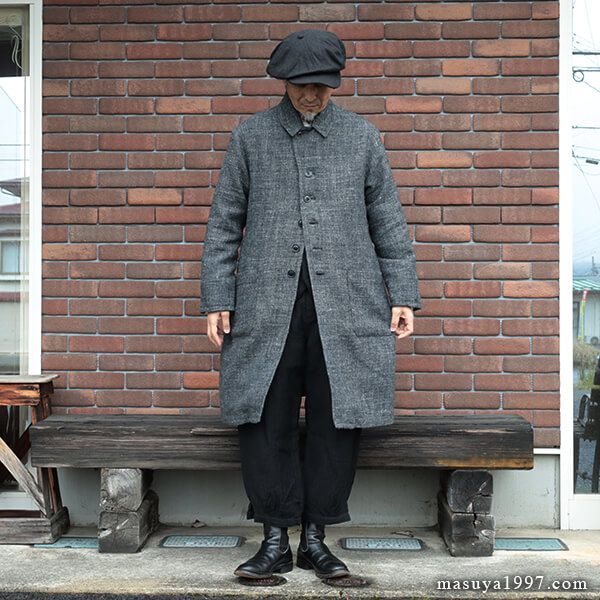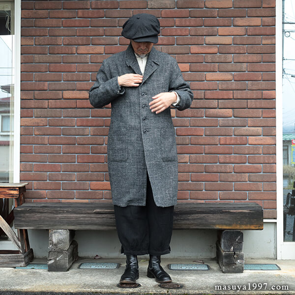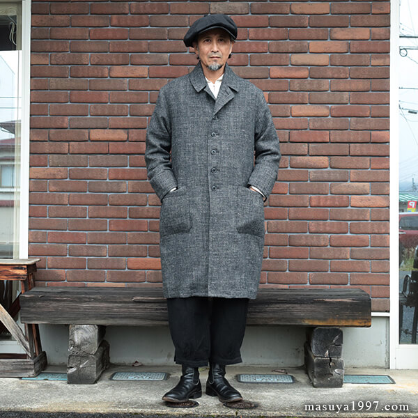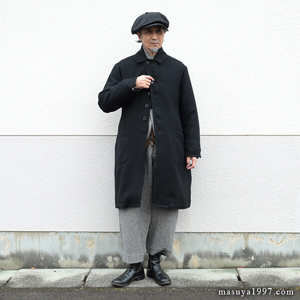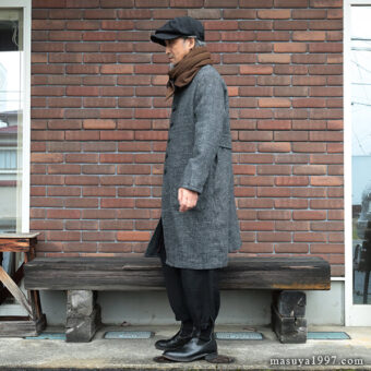 ジャンゴアトゥールの新作、“supérieur shetlandwoollinen dustercoat” でコーディネート。今回は、「ブラック」をウールリネンヘリンボーンのセットアップ(ジャンゴのこの秋の新作)と合わせています。