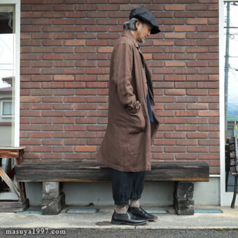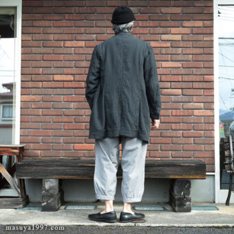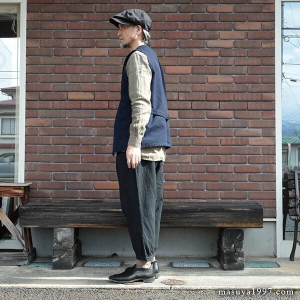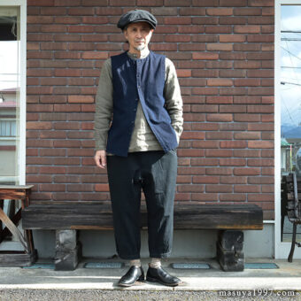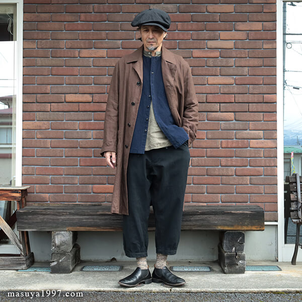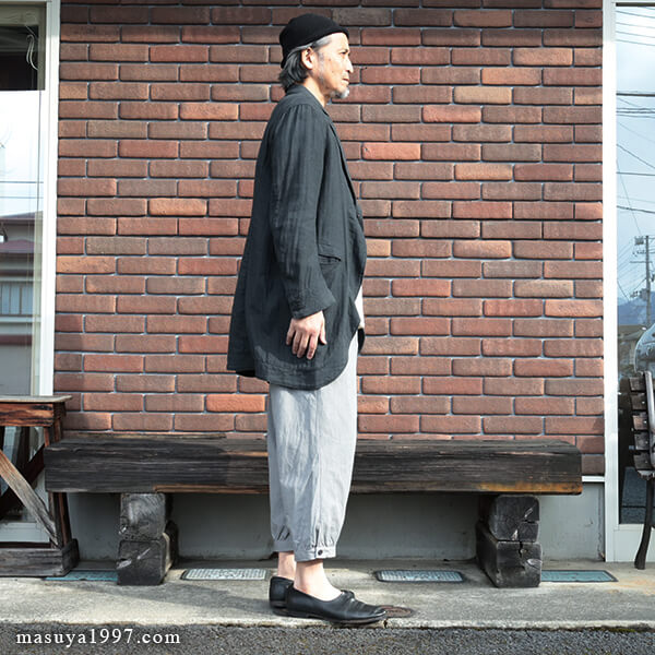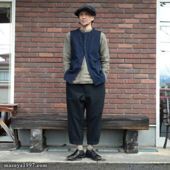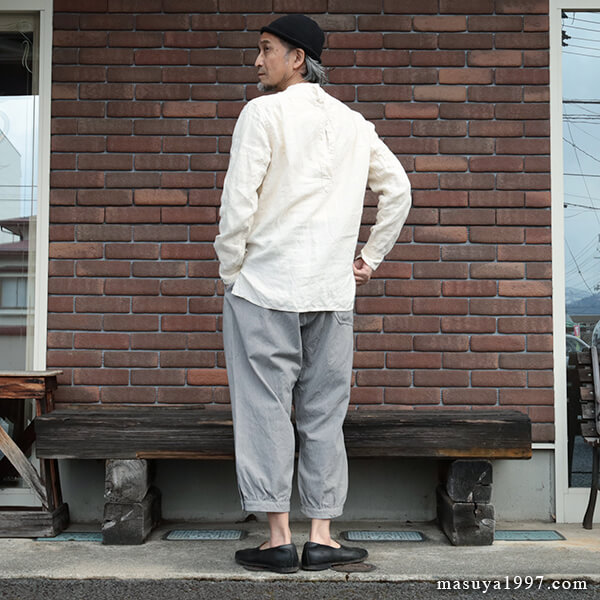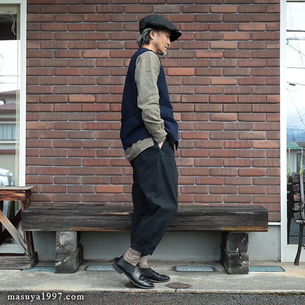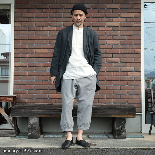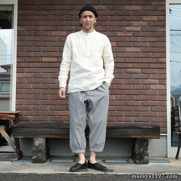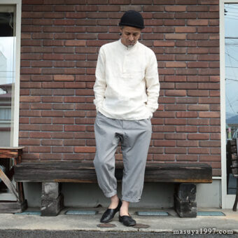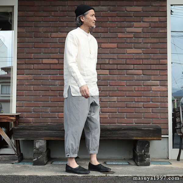 今回は、インナーにオールドホームステッダーのタートルネック・ロングスリーブ、ボトムにはジャンゴのコットンリネン・トラウザー を合わせています。