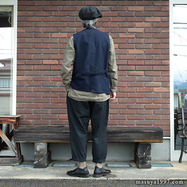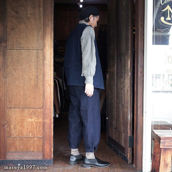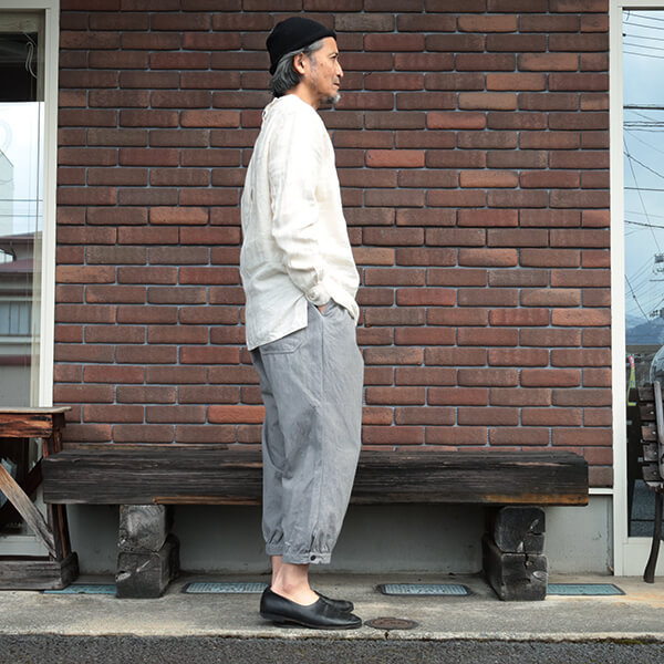 生地は、天然染料を職人技で染め上げたコットンリネンを使用。一年を通して穿いていただける程よい厚さの生地で、リネンが10%入っているので、風合いも良く、夏も着用できます。また、張りとコシのある生地感が、シルエットとも見事にマッチしています。さらに、硫化染料によるムラ染めの色合いは、着用と洗いによってムラ感がジワジワと表れ、より一層雰囲気が増していきます。