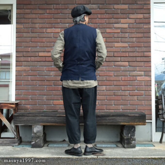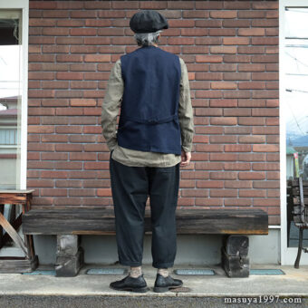当店では、「NAVY」と「TOP CHARCOAL」の M・Lサイズをご用意しました。今回は、「TOP CHARCOAL」を、“GAME VEST” と 白のリネンシャツ に羽織っています。