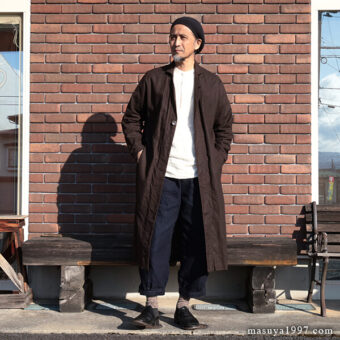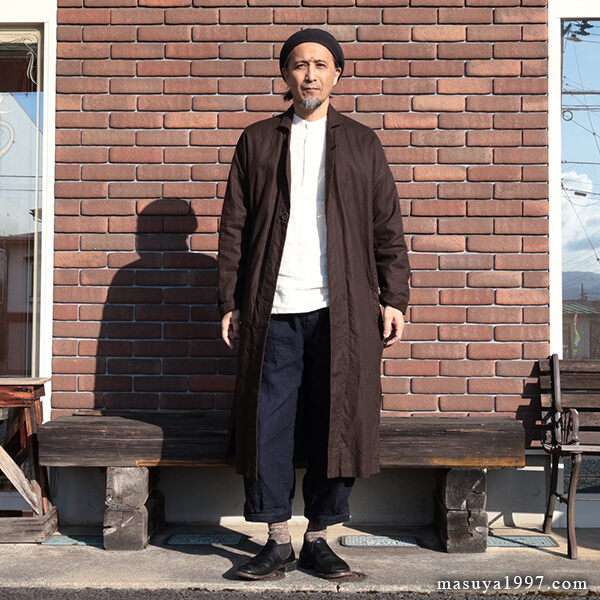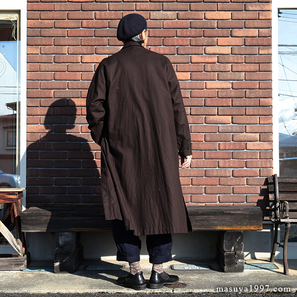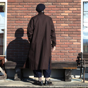 1870年代後期頃の “JARDINIER” (ガーデナー)たちが纏っていたちょっと長めのコートから妄想を重ね、老練なジャンゴアレンジで製作された1枚。ハリのある上質の綿麻ヘリンボーンに岡山産の顔料(ベンガラ)で染め表側に墨コーティングを施した生地も素晴らしく、ガシガシ着たくなります!