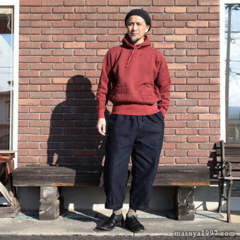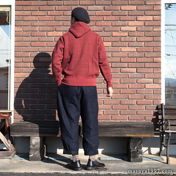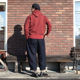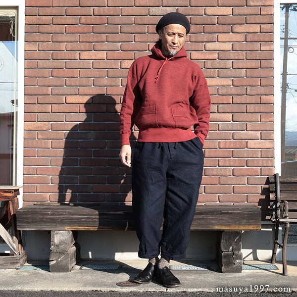 ジャンゴアトゥールの インディゴ・イージーニッカーズ をベースにコーディネート。今回は オールドホームステッダーの スウェットパーカ を合わせています。 こんな感じもいいですね〜!