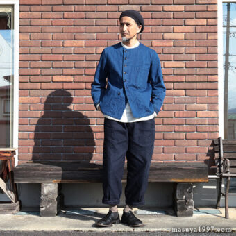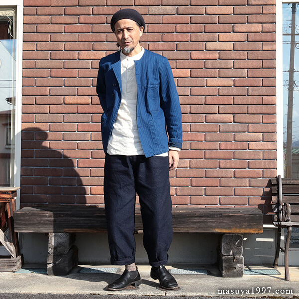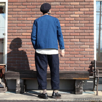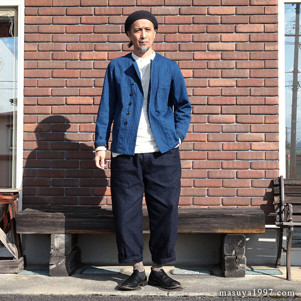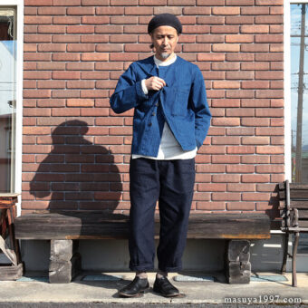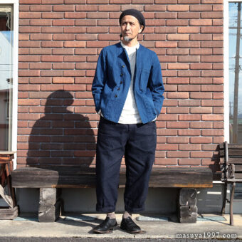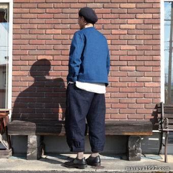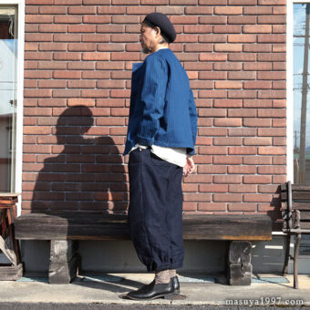ジャンゴアトゥールの インディゴ・イージーニッカーズ をベースにコーディネート。今回は、トップスに フレンチワーク・ブルゾン を合わせています。