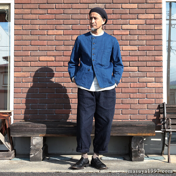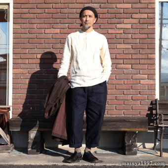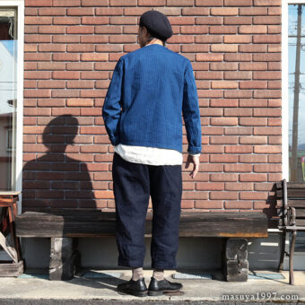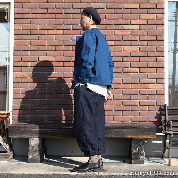 今日も、ジャンゴアトゥールの インディゴ・イージーニッカーズ をベースにコーディネート。トップスには “victorians heavylinen blouson 1880” を合わせています。
