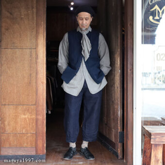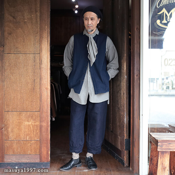 トップスに ジャルディニエシャツ と インディゴベスト を合わせています。 シャツと共生地の クラヴァットもいいですね〜。