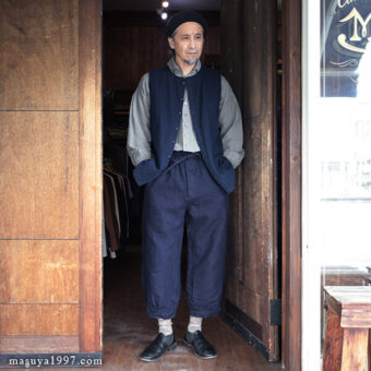 内股の立体的なパターンが特徴的な “french farmers wool pants” を、今回は “JARDINIER”(ガーデナー)の出で立ちをイメージして製作。深めの股上と、太腿~裾の膨らんだシルエット、そして絶妙な股下のレングスが、動きやすくて、かっこいいんです!
