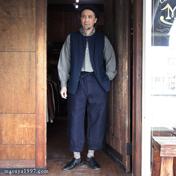 ジャンゴアトゥールの “classic jardinier cottonlinen pants” をベースにコーディネート。