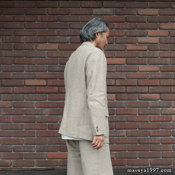 ウエストダーツの無い直線的なシルエットに、生地本来の粗野な表情と迫力ある風合いが見事にマッチ。男らしさの中に、どこか品を感じさせる1着に仕上がっています。