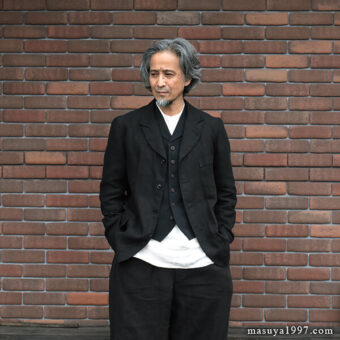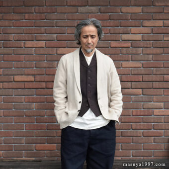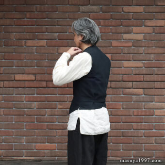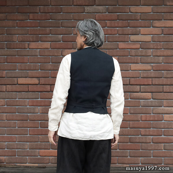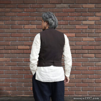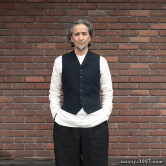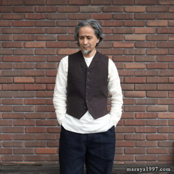 ブラックサインの新作 “Ancient Cloth Wyoming Vest” を着ています。1890年代のワイオミング州に住むカウボーイが着ていたテーラード・ベストがデザインソース。小さめのカラー&ラペルと、浅めのVゾーンが当時に雰囲気を感じさせます。