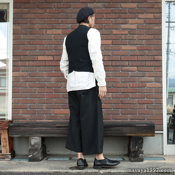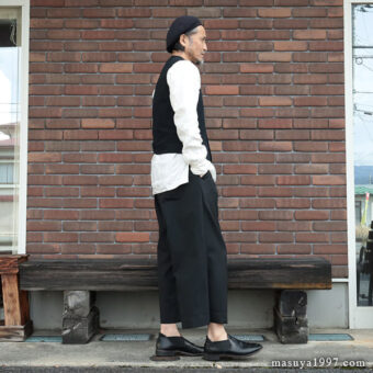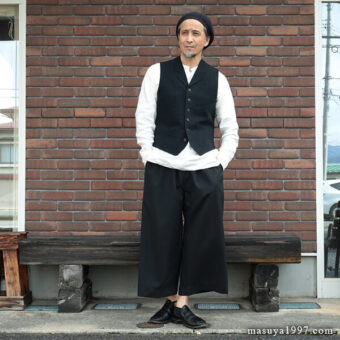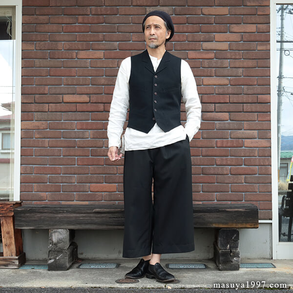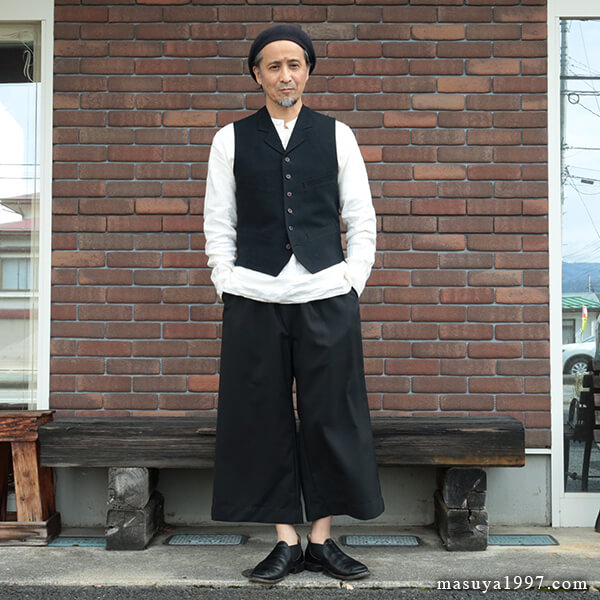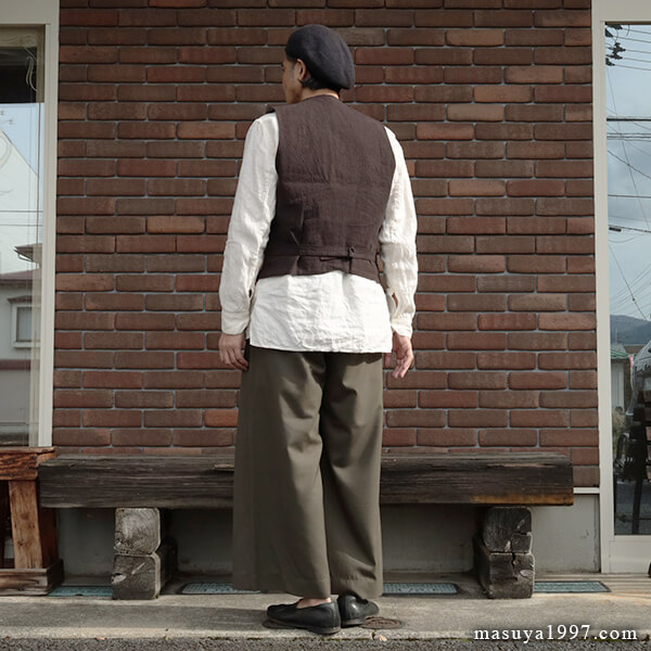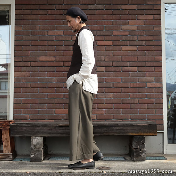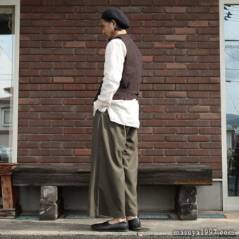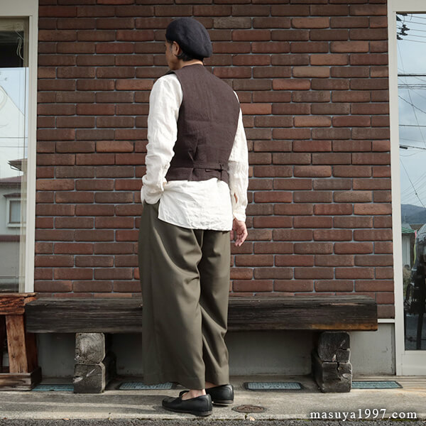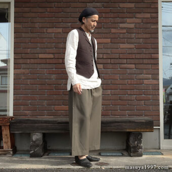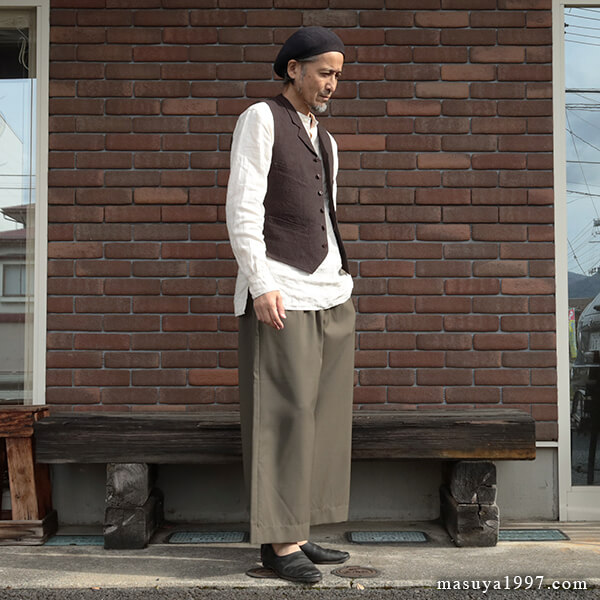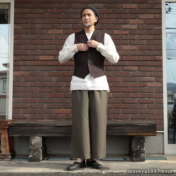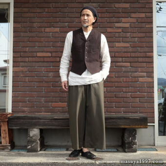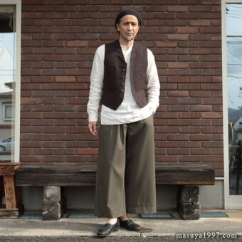トップスは、いつものシャツ&ベストに、サフィラン社のヘヴィリネンで仕立てた シャツジャケット を羽織っています。