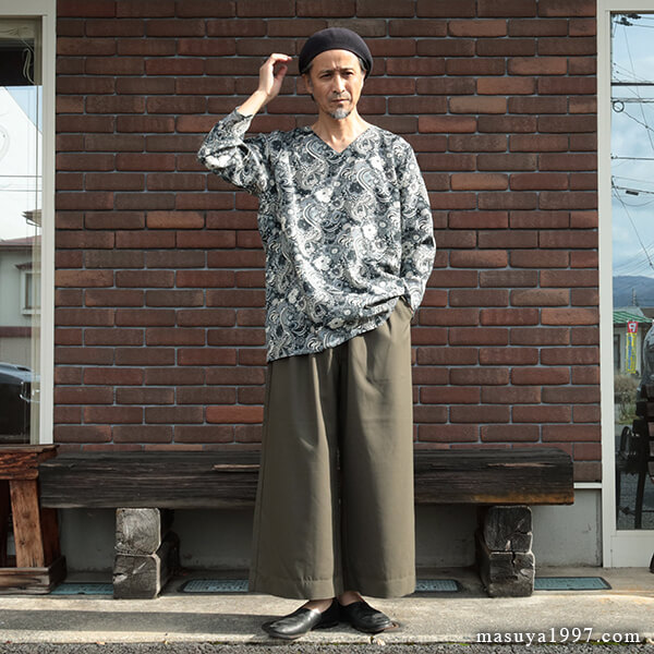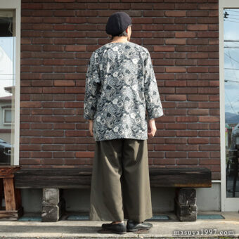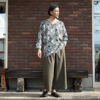 カラーは「Jungle」「Starry」の2色。ここでは「Starry」をチョイス。サイズは「42」をかなり大きめに着ています。ちなみに「40」がちょうどいいサイズです。