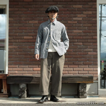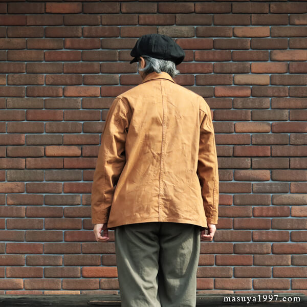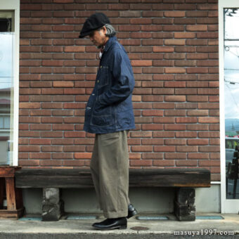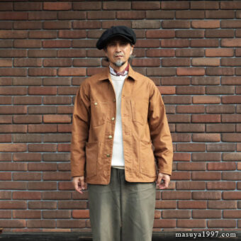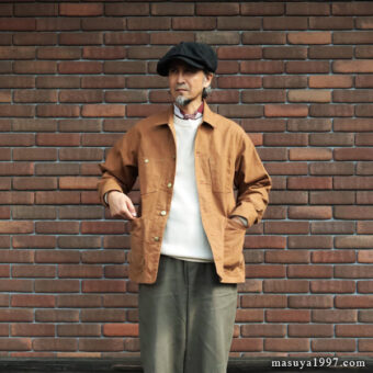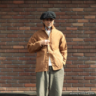 4種類の生地バリエーションの中から、今回は「BROWN DUCK (32-J)」を着ています。タテヨコ7×7のムラ糸を使用した高密度ダック生地です。SULFUR DYE(硫化染め)で仕上げた生地は、雰囲気が良くフェード感も楽しめます。また、軽めの生地なので、さらっと羽織れます。
