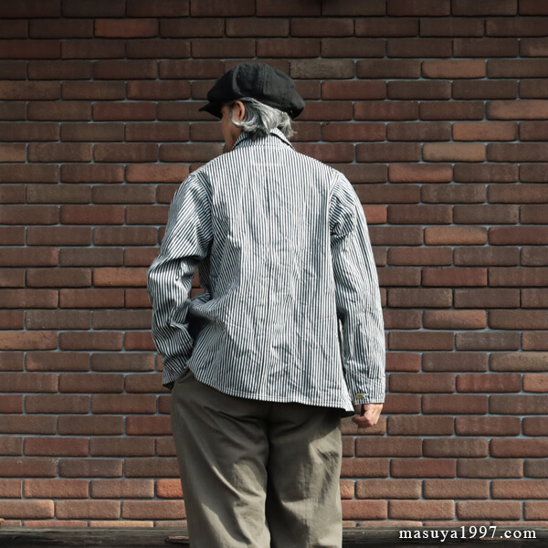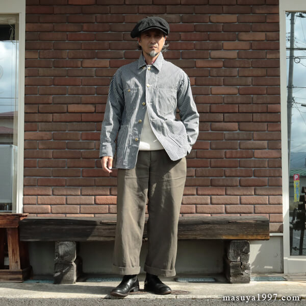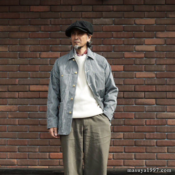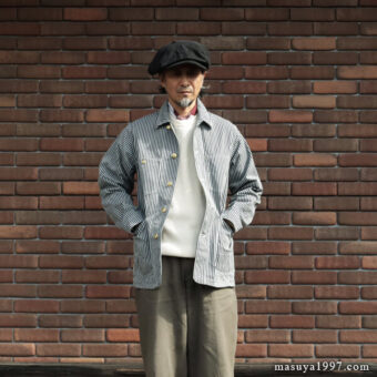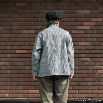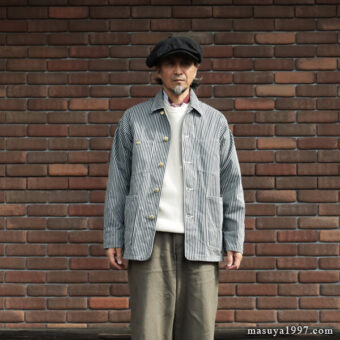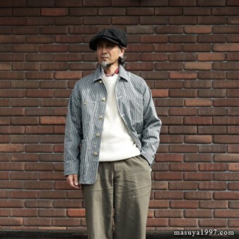 4種類の生地バリエーションの中から、今回は「EXPRESS STRIPE (37-J)」を着ています。タテ糸ロープ染色のインディゴ、ヨコ糸グレーを使用した高密度に織り上げたヒッコリー。タテヨコ14/-の糸を使用した、薄手ながらハリ感があってタフな生地です。エクスプレスストライプも洗うと目が詰まって若干濃くなります。