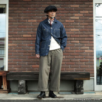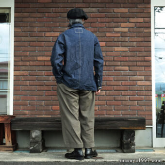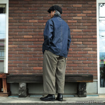 4種類の生地バリエーションの中から、今回は「10oz DENIM(31-J)」を着ています。ヴィンテージのワークウェアに使われていたデニム生地を検証し、タテ糸の特徴的な短いムラ感にこだわって再現。ヨコ糸はネップ糸を使い粗野な風合いを出しています。ヨコ糸は移染した色目を出す為、染まっているかいないかの絶妙なアイボリーに染め、仕上げで毛焼きを省き、ヴィンテージの風合いを感じる生地に仕上げています。