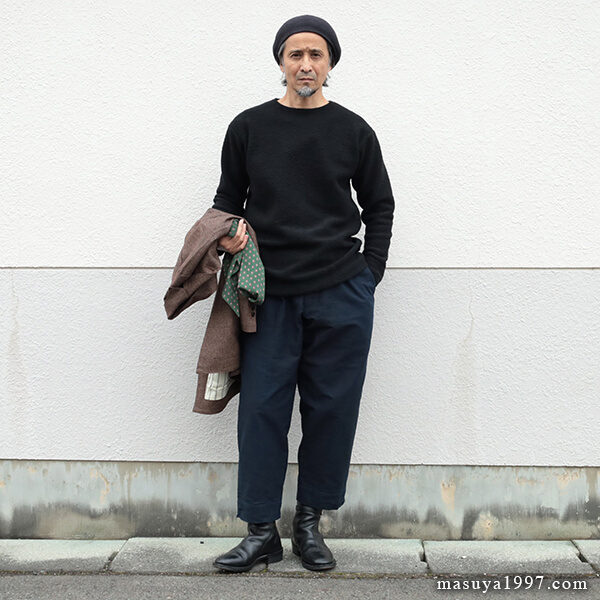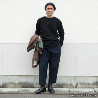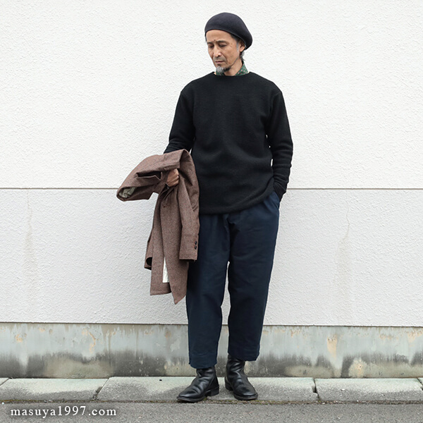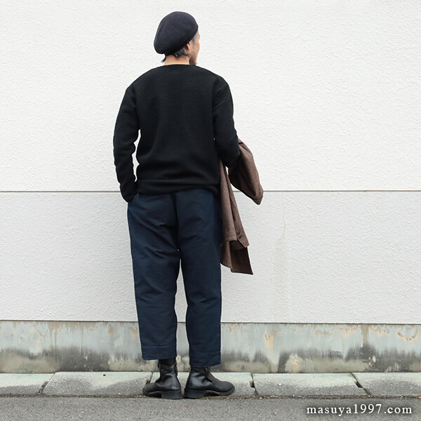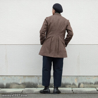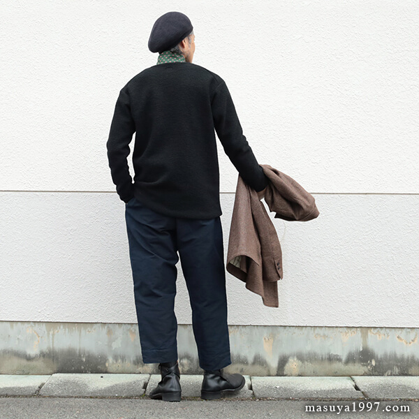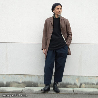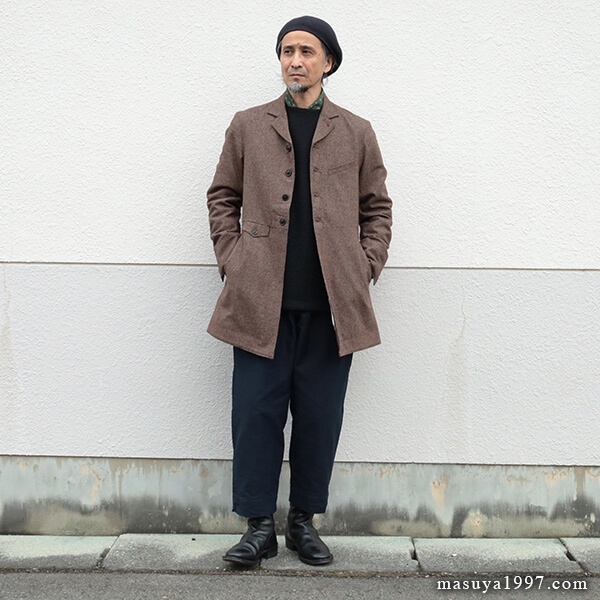 今回は、同じくジャンゴの classic bakers wool jacket” と合わせています。