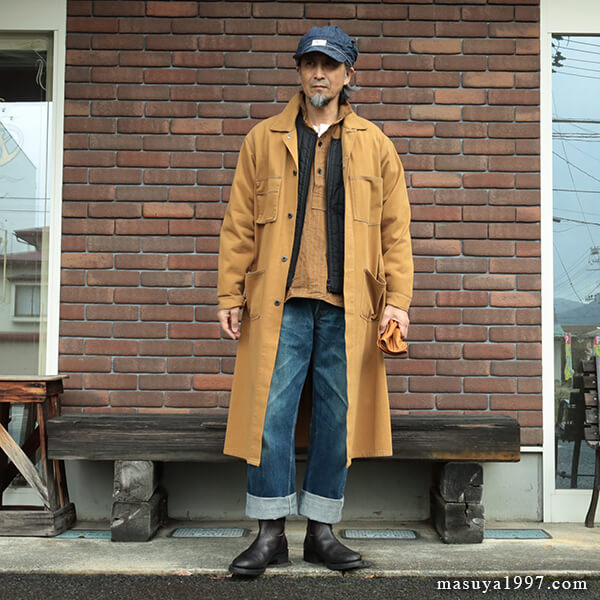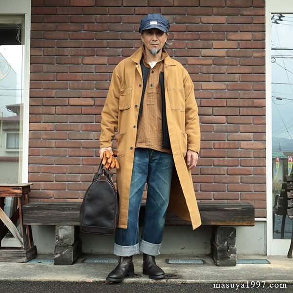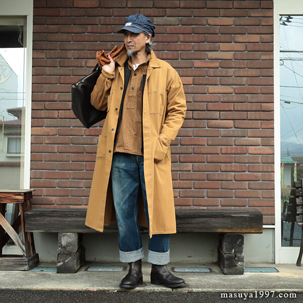インディゴのジャケットに、オールドオイルのオリーブ。渋いですね〜!