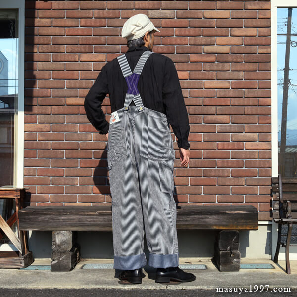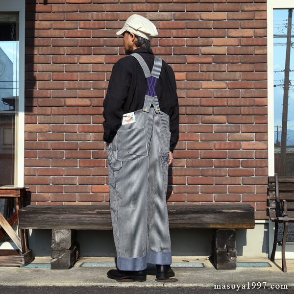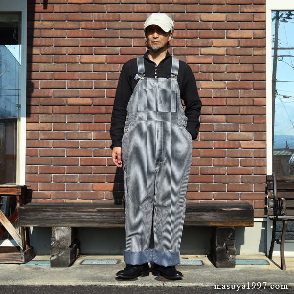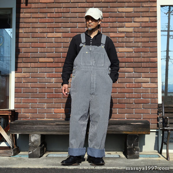 DURA-BILTの新作 “3 SERIES LOW BACK OVERALLS” <EXPRESS STRIPE / 37-LB> を穿いています。